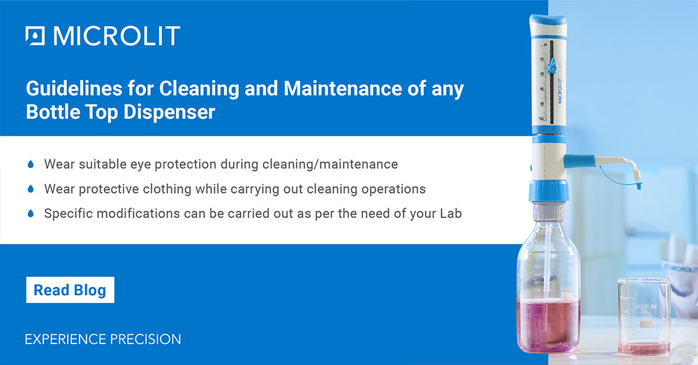 Bottle Top Dispensers are used with various reagents sometimes with very aggressive chemicals. The residue of any chemical can impact results in a new analysis. Therefore, it is very important to clean bottle top dispensers after use or before using any fresh chemical/solvent/reagent.
