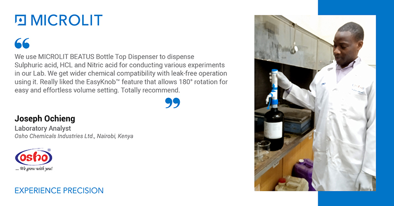 Mr Joseph Ochieng, Laboratory Analyst at Osho Chemicals Industries Ltd. in Nairobi (Kenya) says that Microlit BEATUS is an excellent Bottle Top Dispenser equipped with Springless Valve® technology. Prior to using BEATUS BTD, they used measuring cylinders to conduct various experiments. Microlit products have simplified their Lab routine procedures and they get quick, accurate results.