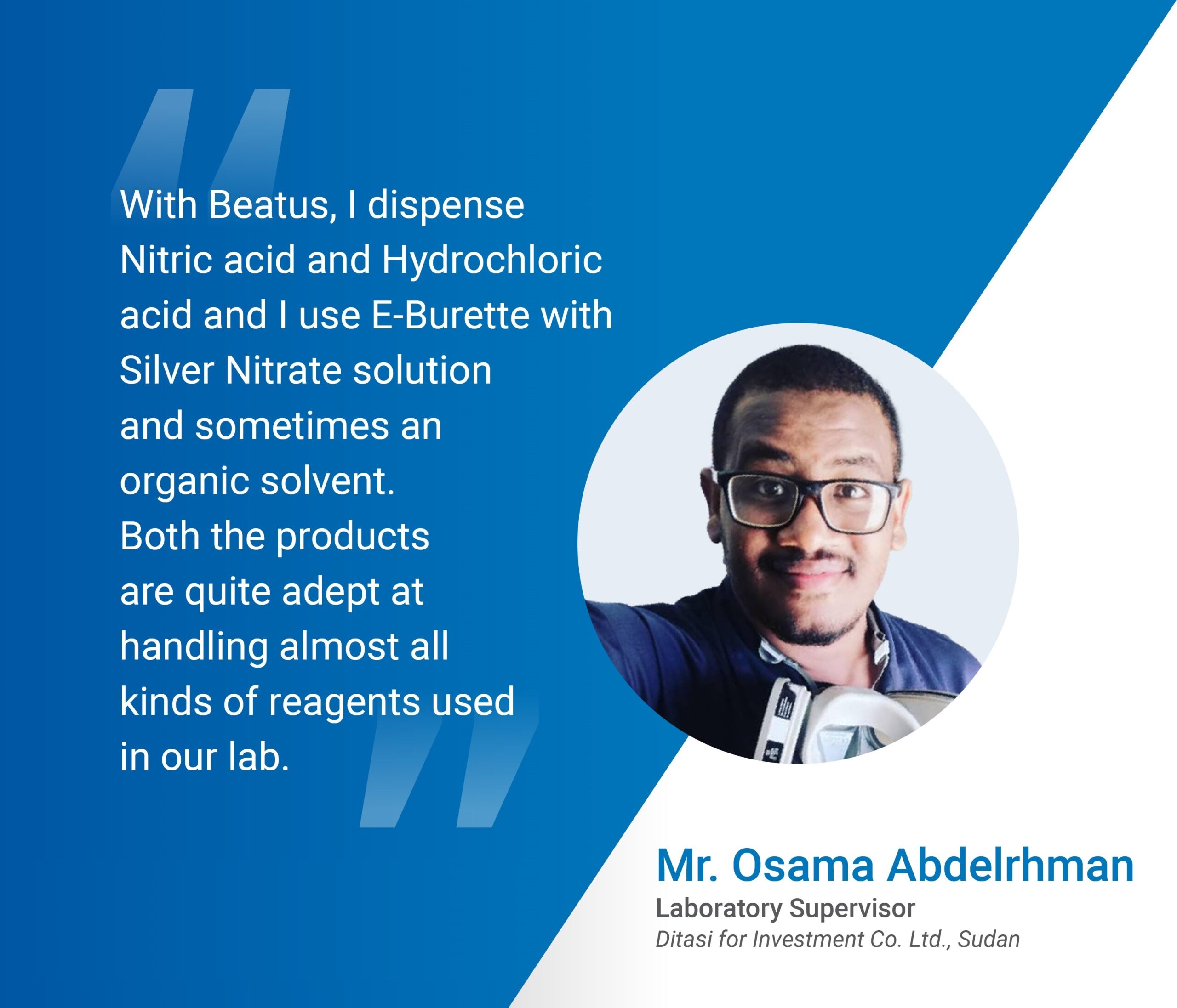 Ditasi for Investment Co. Ltd. owns and manages mines and undertakes the extraction of gold and other minerals. They are currently using the Microlit Beatus Bottle Top Dispenser and the E-Burette in their lab and have been impressed by the efficiency of the instruments. They applauded the functionality of Microlit products and shared how the instruments have helped save them time & effort reducing the chances of manual errors.